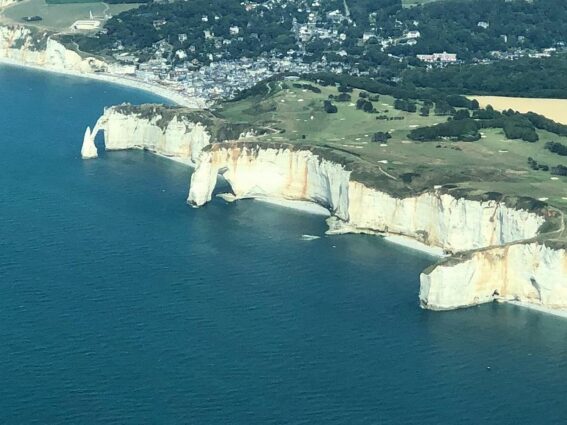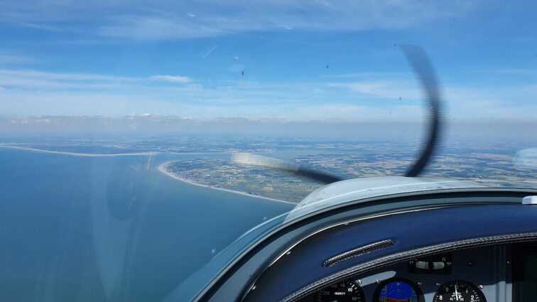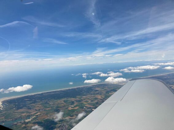 Hoewel we binnenkwamen op de verharde runway 09 kiezen we nu voor het gemak de tegenovergestelde richting, piste 27. Gezien er geen wind is maakt dit ook niet veel verschil uit.Via Cap Blanz Nez, die volledig bedekt is door de wolken volgen we zuidwaarts de kustlijn tot aan de monding van de Somme. Lille Info vraagt enkelen van ons te klimmen tot op 2500 ft teneinde op veilige afstand te blijven van het in- en uitgaand vliegverkeer van het druk bezochte Le Touquet.